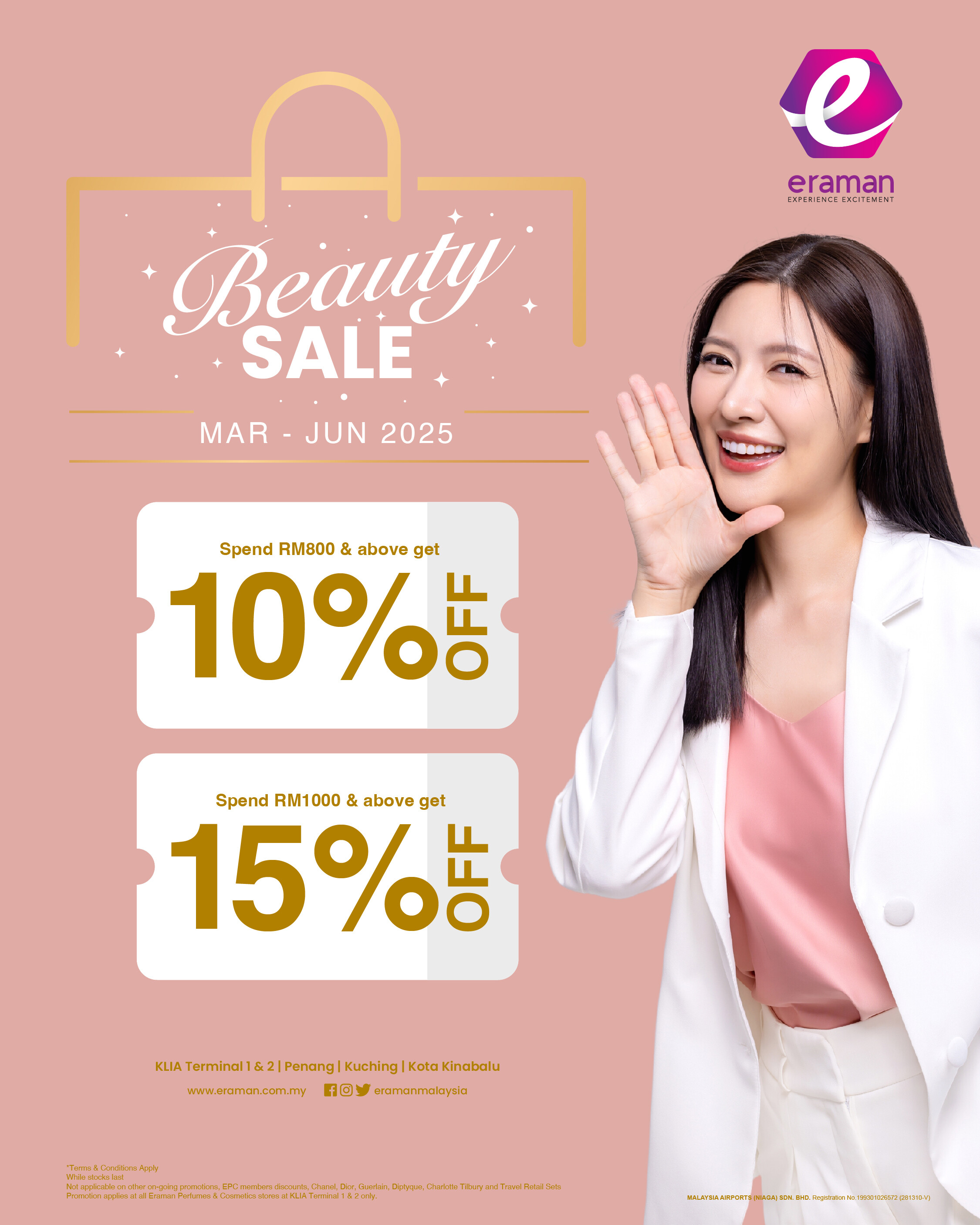 Spend RM800 & above – Enjoy 10% OFF Spend RM1000 & above – Enjoy 15% OFF March – June 2025 Available at Eraman Perfumes & Cosmetics stores, KLIA Terminal 1 & 2 only *Selected beauty products. *While stocks last.