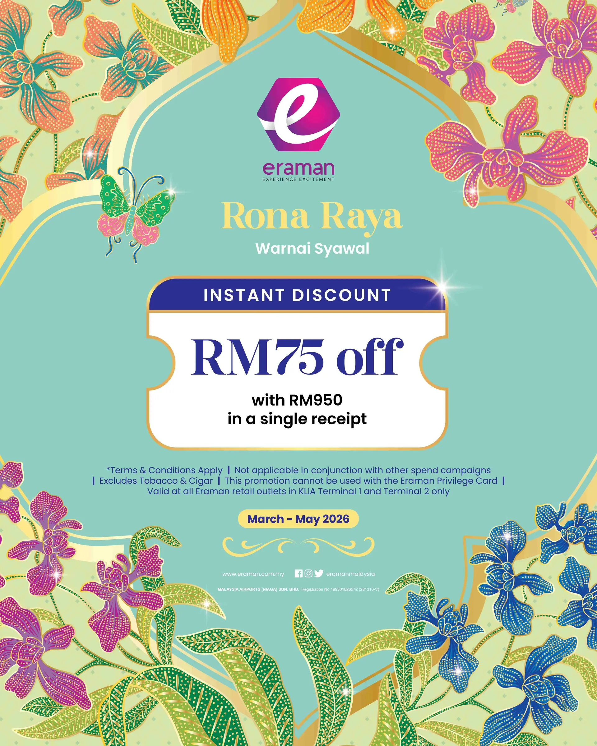 Add some sparkle to your journey with an instant RM75 OFF when you shop at Eraman! Whether it's premium gifts or travel treats, we've got your Raya shopping covered.