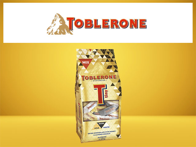Enjoy delicious moments with Toblerone Tiny! This golden bag contains 34 individually wrapped pieces of delicious Toblerone Milk, White and Dark Chocolate with honey and almond nougat in miniature bars. Εxclusively available in travel retail.