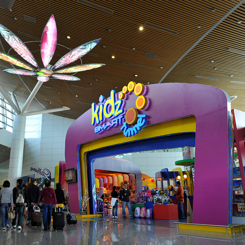 One of our retail attractions at KL International Airport is the Kidz Smart Tunnel (KST). It emerged as the winner of the prestigious UK-based DFNI Product Awards in 2009 for the category of “Best New Store (Confectionery Fine Foods)”.The KST features a unique open tunnel concept where colourful dinosaur bones form arches over a passageway.